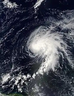 A tropical wave moved westward off the coast of Africa on July 14.[44] After tracking steadily westward, an area of thunderstorms became more concentrated as its upper-level environment became more favorable,[45] and late on July 19 the National Hurricane Center classified it as Tropical Depression Six while it was located about 1,035 miles (1,666 km) east of the Lesser Antilles.[44] Upon being classified as a tropical cyclone, the depression maintained two ill-defined hooking bands to its north and south, and was originally forecast to attain hurricane status before passing through the Lesser Antilles. With warm waters and very light wind shear forecast, its environmental conditions met four out of five parameters for rapid intensification.[46] Subsequently, convection diminished as the result of cold air inflow and instability from a disturbance to its southeast.[47]
