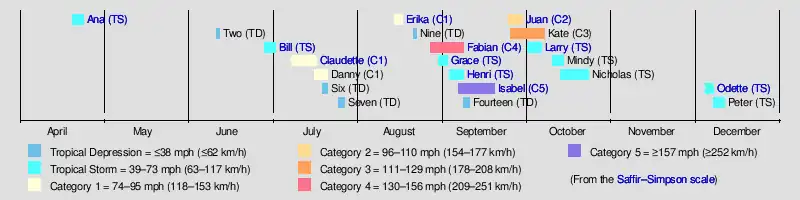 Tropical Storm Odette (2003)Tropical Storm Larry (2003)Hurricane JuanHurricane IsabelTropical Storm Henri (2003)Tropical Storm Grace (2003)Hurricane FabianHurricane Erika (2003)Hurricane Claudette (2003)Tropical Storm Bill (2003)Tropical Storm Ana (2003)Saffir–Simpson scale