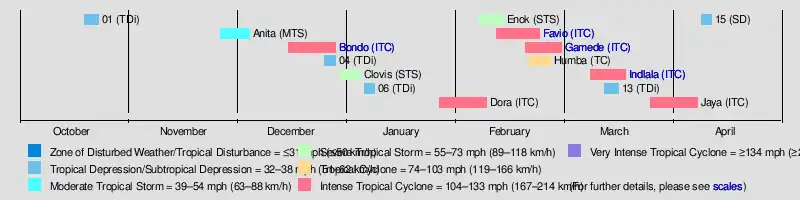| Dora | January 26 – February 8 | Intense Tropical Cyclone | 195 km/h (120 mph) | 925 hPa (27.32 inHg) | Rodrigues | |||