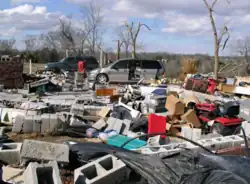 The tornado then tracked into Trousdale County and passed through rural areas to the northwest of Hartsville, weakening slightly to high-end EF2 strength. Frame homes were damaged or destroyed, vehicles were tossed and damaged, numerous trees were snapped and denuded, and mobile homes were obliterated with debris and insulation strewn long distances downwind. Ten homes were destroyed, and 23 homes had major damage along this segment of the path. As a result of the tornado, a major fire occurred as a natural gas plant was ripped apart by the tornado in the southwestern portion of the county. The area was evacuated and no one was injured at the plant. Two people were killed at a home along US 231, and five other people were injured in the county.[65][66][4][67] Crossing into Macon County, the tornado regained EF3 intensity as it struck the western and northern sections of Lafayette, resulting in widespread, major destruction in the area. Numerous homes and several churches were destroyed in Lafayette, with several leveled to the ground. An auto sales business in town sustained heavy damage as well. Surveyors observed major damage to a large, expensive brick home that was built unanchored on a very weak, unreinforced cinder block foundation. The house shifted off the foundation during the tornado, causing walls to buckle and collapse. 170 homes were destroyed, and 9 homes had major damage in the Lafayette area. Thirteen people were killed in and around town, and 44 others were injured. President George W. Bush toured the Macon County destruction on February 8 and promised relief to individuals.[68] The logging industry in Macon County was hit hard, with about a million dollars worth of trees destroyed. Debris from Lafayette was found as far north as Sano, Kentucky, in Adair County, approximately 70 miles (113 km) to the northeast.[69] Sixteen thousand TVA electricity customers in Macon and Trousdale Counties lost power, some of whom did not have their service restored for a week.[70][71] Macon County schools were closed until February 19.[72][73][74][75] In total, roughly 260 houses in the three Tennessee counties were destroyed, and damage amounts were estimated at $78 million in Macon County alone.[76][77]