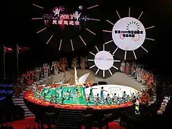 A flower show was opened to the public on 13 May at Victoria Park. The show lasted 10 days featuring 60,000 pots of themed flower. Around 200 organizations from 20 countries participated in the show.[16] The new Tseung Kwan O Sports Ground was opened on 19 May to celebrate the 200 days count down. A relay race was held between the HK police, HK immigration department, Leisure and Cultural department, HK Fire service, Customs and Exercise department, Hong Kong University of Science and Technology and Sai Kung District sports association.[17] There was a dragon and lion dance performance and a tree planting ceremony.[17] A cheerleading competition was also held.[18]