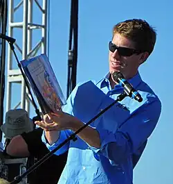 Although Stewart was leading the race near the end, Edwards passed him after the final pit stops.[17] Stewart, who finished second, said, "I don't know what happened on the pit stop there, but we had a miscue and had a penalty and had to go to the back, and unfortunately it kind of dealt our cards for us. [Crew chief] Darian Grubb made a good call getting us the track position back, but it also showed everybody else that they could do it, too, and we couldn't run two-and-a-half runs on a set of left-side tires."[18] In the subsequent press conference, Kyle Busch stated his frustration from his accident, "On the restart there [on Lap 107], I was going to bide my time and try to get back through traffic with plenty of time to go, and 'kablooey' – it just broke."[18] Doug Yates, the engine builder for Roush Fenway Racing, expressed his enjoyment of winning the race: