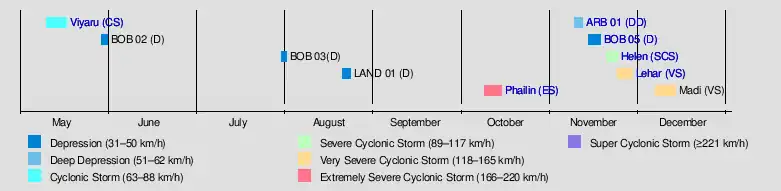 This is a table of all storms in the 2013 North Indian Ocean cyclone season. It mentions all of the season's storms and their names, durations, peak intensities (according to the IMD storm scale), landfall(s) – denoted by bold location names – damages, and death totals. Damage and death totals include the damage and deaths caused when that storm was a precursor wave or extratropical low, and all of the damage figures are in 2013 USD.