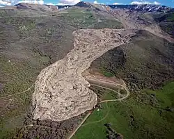 Unseasonably heavy rains during May 23–24 melted the local snowpack and saturated the ground to the point of instability.[8] A small landslide was recorded at approximately 7:18 AM on May 25, and minor slope movement was noticed throughout the day.[9] At 5:44 PM on May 25[10] a large chunk of the West Salt Creek valley headwall (known as the "slump block") collapsed catastrophically.[11] The initial collapse triggered a wave of subsequent rock failures (a "rock avalanche") that moved 2.8 miles (4.5 km) down the valley of West Salt Creek, burying almost 600 acres (240 ha) of land under 38 million yd3 (29 million m3) of debris.[1] The average speed of the landslide was about 45 miles (72 km) per hour,[6] with a maximum of 75 to 140 miles (121 to 225 km) per hour,[9] and its maximum depth reached 123 feet (37 m).[5] The slide descended a total of 2,300 feet (700 m) from the rim of the Grand Mesa to the valley below.[11] The speed of the slide was likely increased by a layer of liquefied material underneath the main rock avalanche.[7] Residents described the sound of the landslide as “a low flying, large military helicopter”, "a very long clap of thunder", or “a freight train coming”.[6]