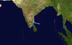 A low-pressure area consolidated into a depression on November 8. It slowly intensified, prompting the JTWC to issue a Tropical Cyclone Formation Alert (TCFA) for the system, but was eventually cancelled despite the improving appearance prior to landfall. The IMD later upgraded the system to a deep depression before it crossed the coast of Tamil Nadu near Puducherry the following day with peak wind speeds of 55 km/h (35 mph) and a minimum central pressure of 991 hPa (29.26 inHg). Due to land interaction and high vertical wind shear, the system weakened into a well-marked low-pressure area over north Tamil Nadu on November 10.