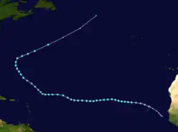 On August 17, the NHC highlighted the potential for tropical cyclogenesis off the western coast of Africa in subsequent days.[61] A weak area of low pressure associated with a tropical wave emerged into the eastern Atlantic three days later,[62] and the disturbance steadily coalesced into a tropical depression by 12:00 UTC on August 22, about 305 mi (490 km) southwest of the southernmost Cabo Verde Islands.[28] The depression organized while heading northwest, intensifying into Tropical Storm Gaston six hours later and attaining hurricane intensity by 12:00 UTC on August 24, in accordance with data from satellites and a NASA Global Hawk unmanned aircraft.[28][63] After its initial peak in intensity, Gaston's satellite appearance began to degrade as an upper-level low imparted strong southwesterly shear on the cyclone,[64] causing it to weaken back to a tropical storm.[28] Upper-level winds slackened early on August 27, and a timely microwave pass highlighted the presence of a low-level eye well embedded in the storm's central dense overcast, indicating the resumption of Gaston's intensification phase.[65]