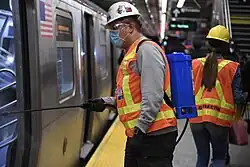 By mid-April, ridership on the subway had decreased by 92% due to the pandemic.[177] Bus ridership dropped less, with some routes retaining up to half their normal ridership.[178] To cover a potential revenue shortfall of up to $8.5 billion, the MTA faced having to cut service more permanently, or deferring capital improvements, even though transit experts said that the New York metropolitan area could not function without an effective transit system.[179] On April 20, four City Council members requested that subway service be temporarily suspended due to the spread of COVID-19 in the subway system,[180] but interim New York City Transit president Sarah Feinberg opposed it.[181][182] Other politicians such as de Blasio advocated for shutting down some terminal stations overnight to clean the trains.[183][184] The number of homeless individuals in the subway had also increased, a situation that Cuomo described as "disgusting and disrespectful".[185][186] Starting on May 6, 2020, stations were closed overnight for cleaning, in what became the first planned overnight closure in the subway's history. The overnight closures would be a temporary measure that would be suspended once the pandemic was over, and during the overnight closures, bus service was added.[187] During the closures, trains and stations were cleaned more than usual.[188][189] Although officials stated that only one percent of subway ridership occurred at night, trains continued to run overnight, leading to complaints that essential workers were being unnecessarily inconvenienced. Internal MTA sources stated that it was theoretically possible for the MTA to clean the system without closing it.[190] The NYCTA also announced that families of workers who died of COVID-19 would be eligible for $500,000 in death benefits.[191][192]