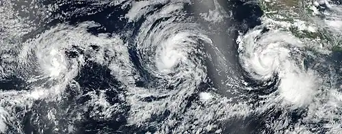 Tropical Storms Greg (left), Irwin (center), and Hurricane Hilary (right) spanning the East Pacific on July 24
