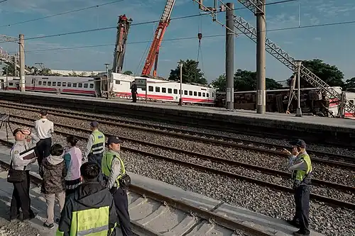 All trains in the eastern trunk line were halted in both directions, with replacement bus services provided.[13] Hundreds of medics and firefighters, and 100 soldiers responded to the scene.[14] As of 21:35 local time all passengers, including the dead, had been removed/evacuated from the wreckage.[15] The derailment was the worst train accident in Taiwan since 1991, when 30 people were killed in a collision near Miaoli[8] until a train derailment in 2021 killed 49 people in Hualien.[16]