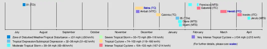 For the second consecutive year in a row, the first system formed before the official start of the season. Afterwards, three storms formed in the month of December: Tropical Cyclone Belna on 2 December, which brought flooding and strong wind to northwestern Madagascar, Very Intense Tropical Cyclone Ambali, which formed a day later and became the first very intense tropical cyclone in the basin since Fantala in 2016, and Tropical Cyclone Calvinia which stalled near Mauritius and brought heavy rain and moderate flooding to the island nation towards the end of the month, crossing into 2020. The rest of the year would remain quite weak until Intense Tropical Cyclone Herold formed in March, becoming the first major cyclone of 2020. Just weeks after, Intense Tropical Cyclone Irondro in April would become the third intense tropical cyclone of the season. The season would later conclude with the dissipation of Moderate Tropical Storm Jeruto on 16 April. The season had little impact on land with the fact that all storms that formed with the exception of Belna, Diane and Francisco did not make any direct impacts on land and stayed out to sea.