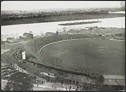 According to club historians, it was incorporated at the Temperance Hall, Napier Street at Emerald Hill 19 June 1874.[10] It was first known as "Cecil Football Club" (after Cecil Street, South Melbourne, one of the early thoroughfares),[11] but adopted the name "South Melbourne Football Club" four weeks later on 15 July.[12] The club was based at Lake Oval alongside the lake in Albert Park, also home of the South Melbourne Cricket Club.[13][14]