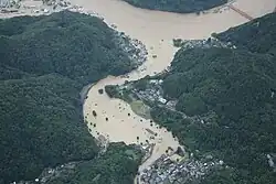 The 2020 Kyushu floods were a series of floods in July 2020 brought on when record-breaking heavy rain hit the prefectures of Kumamoto and Kagoshima, on the southern Japanese island of Kyushu, on 4 July 2020 in the middle of the East Asian rainy season. The event is officially referred to as Reiwa ni-nen shichi-gatsu gōu (令和2年7月豪雨; "Heavy rain of July, Reiwa 2") by the Japan Meteorological Agency.[1] As a result of flooding and landslides, 77 people were confirmed dead (includes 1 death due to cardiopulmonary arrest) and approximately seven are missing.[2] Fourteen of the victims were residents of an old age home in Kuma, Kumamoto that was flooded. Approximately 15,335 buildings were destroyed, damaged or flooded.[3] Damage was calculated at ¥600 billion (US$5.67 billion).[4]