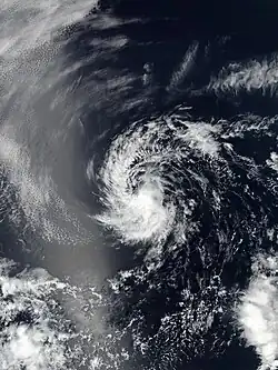 A tropical wave emerged off the west coast of Africa on June 20 and crossed into the East Pacific on July 3, where it interacted with the monsoon trough and began to organize. This system developed a defined surface low on July 6 and was classified as a tropical depression about 435 mi (700 km) south of Acapulco, Guerrero. Steered along a northwest trajectory by a mid-level ridge, the depression traversed a region of favorable conditions which enabled slow intensification.[28] Initial predictions from the NHC suggested significant strengthening of the cyclone.[29] However, Cristina instead encountered cooler waters and eventually drier air; it reached its peak intensity late on July 10 with winds of 70 mph (110 km/h) as it passed west of Socorro Island. Thereafter, the cyclone turned west along the south side of the subtropical ridge and steady weakened. The storm degraded into a remnant low around 18:00 UTC on July 12 and degenerated into a trough on July 15 about halfway between Hawaii and Baja California Sur.[28]