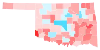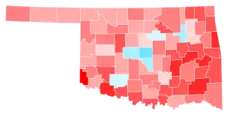 Trump easily carried Oklahoma on Election Day by a margin of 33.08%, down from 36.39 points in 2016. Oklahoma was one of two states where Trump won every county (though Oklahoma County was won by a plurality of votes, compared to the absolute majorities achieved across the state), the other being West Virginia. This also signaled the fifth consecutive election in which the Republican candidate carried every county in the state, including those counties encompassed by Native American reservations. In this election, Trump also became the first presidential candidate ever to win more than a million votes in Oklahoma.[4] Biden, however, came within 3,326 votes of winning Oklahoma's most populous county Oklahoma County, and won more than 40% of the vote in Oklahoma's second-most populous county Tulsa. No Democratic presidential candidate has won Oklahoma County since Lyndon B. Johnson in his 1964 landslide, or Tulsa County since Franklin D. Roosevelt in his 1936 landslide. This is the first election since 2000 in which not every county voted in the majority for the Republican, as Oklahoma County was won by Republicans with a 49.21% plurality. However, these gains in urban Oklahoma were partly offset by continued falloff in southeast Oklahoma, where Biden even underperformed Hillary Clinton's performance four years earlier in most counties.
