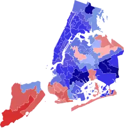 In 2019, New York City voters passed Ballot Question #1 to amend the City Charter to "give voters the choice of ranking up to five candidates in primary and special elections for mayor, public advocate, comptroller, borough president, and city council beginning in January 2021".[6] The first election in the city to use ranked-choice voting (Instant-runoff voting) was in the 24th council district in Queens, which took place on February 2, 2021.[7] This was the first time ranked-choice voting was used in the New York City mayoral election.