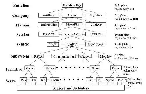 4D/RCS prescribes a hierarchical control principle that decomposed high level commands into actions that employ physical actuators and sensors. The figure for example shows a high level block diagram of a 4D/RCS reference model architecture for a notional Future Combat System (FCS) battalion. Commands flow down the hierarchy, and status feedback and sensory information flows up. Large amounts of communication may occur between nodes at the same level, particularly within the same subtree of the command tree:[5]