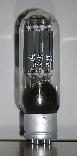 The 845 power triode is a radio transmitting vacuum tube which can also be used as an audio amplifier and modulation tube. Typically, the plate is machined from solid graphite in order to accommodate high power dissipation (up to 100 watts) and voltage. Some current production 845 tubes have metal plates.