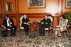 [24] In 1992, the reform process ended abruptly when the army took power and scrapped elections that were about to bring the fundamentalist Islamic Salvation Front to power.[24] This triggered a civil war that would last throughout the 1990s.[24] During this period, Bouteflika stayed on the sidelines, with little presence in the media and no political role.[12] In January 1994, Bouteflika was said to have refused the Army's proposal to succeed the assassinated president, Mohamed Boudiaf; he claimed later that this was because the army would not grant him full control over the armed forces.[12][25] Instead, General Liamine Zéroual became president.[12][25]