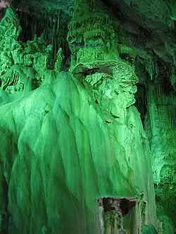 Abukuma-dō (あぶくま洞 - Abukuma Cave) is a limestone cave located in Fukushima Prefecture, Japan. [1]The cave was discovered on August 15, 1969, northeast of the city of Tamura and was originally named Kamayama Shonyu-do (釜山鍾乳洞). It was designated a natural heritage of the town on February 7, 1971, and renamed Abukuma-dō on June 1,1973.[2] Visitors can traverse a 600-metre-long path inside the cave as well as a 120-metre-long exploration course to view the stalactites and stalagmites. Each stalactite has taken more than eighty million years to form.[3] Beyond the public areas lie about 2,500 metres of cave that are not open to the public. Nearby Abukuma Cave is the smaller Irimizu Shonyu-do (入水鍾乳洞 - Irimizu Limestone Cave), discovered in 1927. Irimizu Limestone Cave was designated a National Natural Treasure on December 28, 1934.[4] The temperature inside Abukuma-dō is approximately 15 °C and the humidity is above 90%.