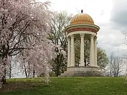 During Strauch's time administering Spring Grove, the first large above-ground monuments appeared.[43] He permitted only a single large memorial per lot, whether single-burial or family plot.[36] This large memorial had to be placed in the center of the lot, and all such objects had to be beautiful, of excellent craftsmanship, and high-quality materials, and all large memorials had to be approved by the cemetery's board of trustees.[20] These large monuments were framed or backgrounded by trees and shrubs, and no other large plantings were permitted on the lot.[20] These "framing" plantings were to be evergreens, and monuments could only be white, gray, or rose so that they would stand out against the evergreens.[39]