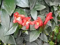 Aeschynanthus pulcher, the lipstick plant or red bugle vine, is a species of evergreen perennial plant in the family Gesneriaceae, native to Indochina and western Malesia.[2] An epiphytic climber, it produces clusters of red flowers from summer to winter.[3] The common name "lipstick plant" refers to the bright red tubular flowers, about 6 cm long,[4] that emerge from a maroon calyx, which resemble lipstick emerging from a tube.[5] The plant may grow 60 cm to 2 meters tall, with an average spread of 50 cm.[4] The leaves are elliptic and are arranged in pairs, with smooth edges.[6]