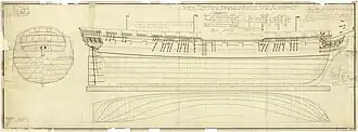 The Aigle-class frigates were 36-gun sailing frigates of the fifth rate designed by Surveyor of the Navy, Sir John Henslow in 1798 for the Royal Navy. Henslow's designs were not wildly innovative and tended towards small modifications on established frigate classes;[3] his alterations being primarily to the size and, in particular, length of ships. British frigate designs were frequently lengthened during this period so that they could reach sailing speeds comparable to French frigates[4] and the Aigle class followed this trend.[3][4]