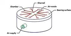 Air bearings (also known as aerostatic or aerodynamic bearings) are bearings that use a thin film of pressurized gas to provide a low friction load-bearing interface between surfaces. The two surfaces do not touch, thus avoiding the problems of friction, wear, particulates, and lubricant handling associated with conventional bearings, and air bearings offer distinct advantages in precision positioning, such as lacking backlash and static friction, as well as in high-speed applications.[1] Spacecraft simulators now most often use air bearings,[2] and 3-D printers are now used to make air-bearing–based attitude simulators for CubeSat satellites.[3]