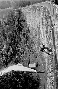 While under Thane's management, the company conceived of and constructed the Salmon Creek Dam and hydroelectric facilities (completed in 1912), and also the Annex Creek plant (completed in 1916), both designed by Harry L. Wallenberg, chief engineer.[12] Salmon Creek Dam, the first thin arch dam ever constructed, was built by Thane with the assistance of some of his former football teammates.[13]