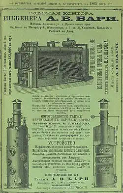 In a few years, the company produced a special steam boiler, designed by Vladimir Shukhov. To mass-produce the invention, Bari built the A. V. Bari Boiler Plant in Tyufeleva Roscha of the Danilovsky District. It became operational in February 1884. In five years since its foundation ‘Bari Technical Company’ assets included the boiler plant in Moscow and several branch offices in Saint Petersburg, Kharkiv, Nizhny Novgorod, and Yekaterinburg.[4]