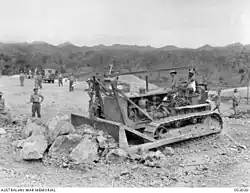 Owers' Corner was named after Lieutenant Noel Owers, who was given the task of surveying a new route from Ilolo to Nauro. The project of constructing a jeep track to Nauro was pushed aggressively by the Chief Engineer at New Guinea Force, Brigadier John Main. Lieutenant Colonel Sidney Bleechmore was placed in charge, and was given the 7th and 2/14th Field Companies and a section of the 2/1st Mechanical Equipment Company.[103][104] Work commenced on 19 August. Removing the trees allowed the sun to dry out the ground, and by adding drainage, a track was created passable by light vehicles, allowing plant and equipment to be brought up. Owers' Corner was reached in early September.[104]