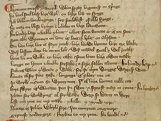 "Alysoun" is an anonymous poem, thought to have been composed in the late 13th or early 14th century.[7] It has reached us as one of the Harley Lyrics, a collection of Middle English lyric poems preserved, among much other material, in British Library Harley MS 2253.[8] The Harley Lyrics were collected and copied into the manuscript between about 1331 and 1341 by a writer known only as the Ludlow scribe, a professional legal scribe who worked in Ludlow, Shropshire between 1314 and 1349.[9] The manuscript was later owned by the 17th-century antiquary John Battely, from whose heirs it was purchased in 1723 by Robert Harley, 1st Earl of Oxford and Mortimer. Harley's collection of books and manuscripts remained in his family for some years, then passed in the mid-18th century to the British Museum.[10][11] The reading public was first made aware of "Alysoun" in 1774, when Thomas Warton included an extract from it in the first volume of The History of English Poetry (1774). It was published in full by Joseph Ritson in his Ancient Songs (1790, recte 1792), and then in George Ellis's Specimens of the Early English Poets (2nd edition, 1801).[12][13]