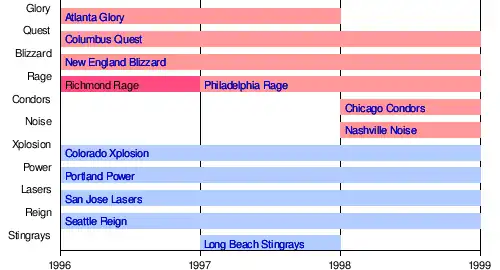 Long Beach StingraysSeattle Reign (basketball)San Jose LasersPortland Power (basketball)Colorado XplosionNashville NoiseChicago CondorsPhiladelphia RageNew England BlizzardColumbus QuestAtlanta Glory