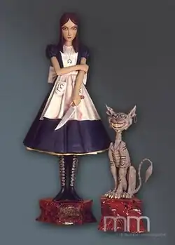 In 2006, Muckle Mannequins created life-sized statues of Alice and the Cheshire Cat on stands with variants for video game stores for international promotion from its success.[30] Costume ware was released under McGee's company Mysterious.[31] Milo's Workshop completed four editions of releases from 2000 to 2009 of official figurines with rare editions of variants of several Alice characters.[32]