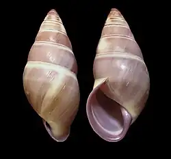 (Original description) The sinistral shell is elongately conical, exhibiting slight striations and is imperforated. It varies much in color, sometimes appearing yellow with green streaks, other times pale or orange-yellow, with the upper whorls displaying a yellowish or brown hue. The apex can be yellow or black-brown, and the upper whorls nearly always feature brown flames or blotches. The lower whorls commonly show a white zone beneath the sutures. Comprising six slightly convex whorls, the shell possesses an elongately-ovate aperture that is angular above and angularly rounded and slightly effused beneath, occupying, with the peristome, about half the length of the shell and having a white interior. The outer lip is strongly reflected, extending so as to reach and even partly cover the backside of the shell, forming a siphonal canal that has the appearance of a very thick peristome. The columella is thickened and, like the lip, of a pale rose-color, with its margins connected by a thin callosity.[2]