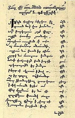 The cultural revival of the 7th century encompassed various areas of literature.[63] Although church matters still held paramount importance, some poets dedicated their creativity to secular themes of the time. Since manuscripts were copied by priests, such works were not transcribed and were lost.[110] Only a small portion of secular poems from the early Middle Ages has reached us.[111] "Lamentation on the Death of Grand Prince Jevanshir," by the poet Davtak Kertogh of the late 7th century, is the first monument of Armenian secular poetry. The text is cited from Movses Kaghankatvatsi's work "The History of the Country of Aluank." According to the "Oxford History of Historical Writing," the "section dedicated to the exploits of Jevanshir ends with the earliest surviving specimen of Armenian secular poetry, which has come down to us since the adoption of Christianity...".[6] No biographical information about Davtak has been preserved.[112] "Lamentation..." is written in the form of an acrostic, where the initial letters of the verses reproduce the Armenian alphabet.[78] According to Theo van Lint's work, Davtak's creativity involves a synthesis of techniques from the oral literary tradition of the gusans and written poetry. Thus, he depicts the process of Christianization of ancient Armenian culture. Van Lint presented Davtak as an example of a Christian gusan. Charles Dowsett suggested that fragments of the text could have been part of a broader public address to Jevanshir, possibly delivered by Davtak himself. Several researchers point to an earlier poetic excerpt preserved in one of the interpretations of Dionysius Thrax's "Grammar".[111] An anonymous commentator of the "Grammar," in explaining another phrase, provides an example from "David's Poem." It's just three lines dedicated to King Tigran and his sister Tigranuhi. Elsewhere in the same text, David is mentioned as the author of the work "Armeno-Marakian War". Some scholars consider him a separate author, while others identify him with the philosopher David the Invincible or David Kerakan (David Grammarian).