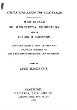 • Mission Life among the Zulu-Kafirs. Memorials of Henrietta Robertson ... Compiled chiefly from letters and journals written to the late Bishop Mackenzie and his sisters. Edited by Anne Mackenzie. With a map, etc., 1866
