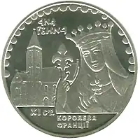 In the 18th and 19th centuries, increased diplomatic contact between France and Russia led to a revived antiquarian interest in Anne, and a number of short biographies were published. In the 20th century, Anne became a symbol of Ukrainian nationalism.[2] On the other hand, a film was produced in the Soviet Union, "Yaroslavna, the Queen of France" (1978), which was not related with "Ukrainian nationalism" in any way. An opera called "Anna Yaroslavna", written by Antin Rudnytsky, was first performed at Carnegie Hall in 1969. In 1998, the Ukrainian government issued a postage stamp in her honour.[4] In 2005, the Government of Ukraine sponsored the construction of a bronze statue of Queen Anne at Senlis, which was unveiled by President Viktor Yushchenko on 22 June.[4] In 2024, a French-trained brigade of the Ukrainian Army was created and named after her.[14]