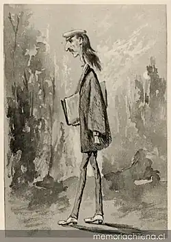 After only a year, he quit and became an illustrator for the political daily El Correo Literario, which was critical of the Conservative Republic. Although handicapped by old, malfunctioning equipment and a dearth of decent supplies, he created a huge number of portrait caricatures of notable people (including his old nemesis, Ciccarelli), with humorous captions or poems by Guillermo Matta.[1] As might be expected, there was much official opposition. President Manuel Montt called on them to stop publishing "esos monos groseros" (those crude monkeys). After less than a year of operation, they had to close up shop, at least temporarily.