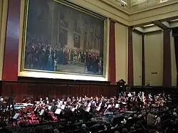 The installation of a dictatorship under General Juan Carlos Onganía led to a marked influence of the Catholic Church over the repertoire, and its new director, Juan Carlos Zorzi, offered up mostly requiems, masses and te deums, as well as frequent collaborations with the Argentine Catholic University's choir. The symphony performed at the reinauguration of the Cervantes Theatre, which had been nearly lost to a 1961 fire, in 1968, though the Onganía regime's continuing hostility to the symphony led to its being stripped of a formal home, and the body performed as a radio orchestra. Losing numerous musicians, Zorzi resigned, and though the 1970 appointment of Spanish conductor Jacques Bodmer as director was followed by a sponsorship from the Italian Embassy, lack of federal support kept the symphony on the brink of closure throughout 1971 and 1972.[3][4] The election of Peronist candidate Héctor Cámpora in 1973 brought with it restored support for the institution, including disbursement for a year's worth of unpaid salaries. A successful Beethoven series at the Luna Park Arena was followed by the 25th anniversary concert, November 29, 1974, memorable for its being held atop the Buenos Aires Sheraton with a televised reprise of Roberto Kinsky's inaugural program. A renewed funding crisis led director Bodmer to return to Barcelona in July 1975, however, and his assistant, Jorge Fontenla, was appointed in his stead. Fontenla's replacement with Bruno D'Astoli in 1978 coincided with the symphony's eclipse by the Buenos Aires Philharmonic, which enjoyed the advantage of a permanent home at the Colón Opera House (while the symphony was relegated to Monday nights at the Cervantes). Its struggles helped result in the 1980 establishment of the Friends of the National Symphony, and though the end of the last dictatorship in 1983 brought with it high hopes, a conflict with the newly appointed general director, Iván Cosentino, resulted in a stoppage during the first half of 1985. Ongoing budgetary problems prompted the new director, Jorge Rotter, to schedule free concerts to the public every other Wednesday as a form of protest during 1987. A renewed crisis in 1990 led to his resignation and the suspension of activities.[2]