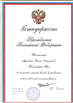 Arkady Ilyich Ostashev (Russian: Аркадий Ильич Осташев; 30 September 1925 – 12 July 1998) was a Soviet and Russian scientist, engineer – mechanic in the former Soviet space program, working on as a designer many of rocket propulsion and control system of Soviet satellites. He was a participant in the launch of the first artificial satellite of the Earth and the first cosmonaut, candidate of technical sciences, docent, laureate of the Lenin (1960) and State (1979) Prizes, one of the leading managers of work in the field of experimental development of rocket technology OKB-1, personal pensioner of republican significance, student and interpersonal relationship of Sergei Korolev.