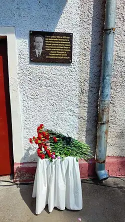 View of the memorial plaque to A.I. Ostashev on the facade of the house No.17 on Tsiolkovsky street where he lived