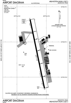 Arlington Municipal Airport (ICAO: KGKY, FAA LID: GKY) is five miles south of Arlington, in Tarrant County, Texas.[1] The airport is at the intersection of Interstate 20 and South Collins Road; it is a reliever airport for Dallas/Fort Worth International Airport and Dallas Love Field.
