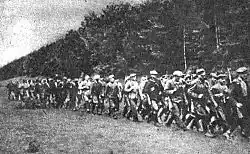 On 1 January 1944, the State National Council (Krajowa Rada Narodowa, KRN) replaced the Gwardia Ludowa with the People's Army (Armia Ludowa).[1] The KRN intended to gain volunteers from other groups. Upon its establishment, the organization comprised some 10,000 members. By the end of July 1944, when much of Poland had been occupied by the Red Army, there were some 20,000–30,000 members,[2] with 5,000 of them being Soviet nationals.[3] Lower estimates quote about 14,000 as its peak strength,[4] whereas high estimates double the middle number, up to 50,000–60,000.[3] About 6,000 of them were active full-time partisans while the remainder were reservists. Whatever its exact size, the Armia Ludowa was much smaller than the Home Army, though it much better armed as a result of Soviet air drops; it might have even had a surplus of weaponry.[5][6][7][8][9] It also had less strict discipline.[9]