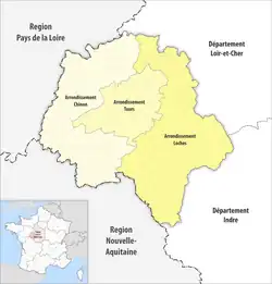 In 1800 the arrondissements of Tours, Chinon and Loches were established. The arrondissement of Loches was disbanded in 1926, and restored in 1943.[2]