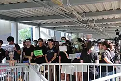 Due to the existence of homophones in Cantonese, Hong Kong's language allows great potential for wordplay. Replacing characters with similar tones or pitch patterns can significantly change a phrase's meaning. An early slang term for the protest, "sending to China" (送中), which is a homonym for "to see off a dying relative", quickly gained attention. Another popular slang term "Railway of the Communist Party" (黨鐵) is a wordplay of MTR Corporation because they sound phonetically similar. To deter online trolls and alleged Chinese spies monitoring the forum, some netizens communicated using phonetically spelled Cantonese words, which are difficult for mainland Chinese to understand.[5] A variety of Cantonese slang also developed during the protest; for instance, when protesters recount the events of their "dreams" (發夢), they are recounting their experiences during the protests. When protesters deploy "fire magic" (火魔法), they are throwing petrol bombs. When a protester chants "it is raining" (落雨), fellow protesters will unfurl their umbrellas to hide the group in action. Fellow protesters were called "hands and feet" (手足), which conveyed the idea of unity.[6]