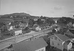 The line and Asker Station opened on 7 October 1872.[2] From 1875 Asker Station had four employees: a station master, a telegraphist and two carriers. The station served 17,466 passengers that year, rising to 33,851 in 1900.[6] Travel time from Asker to Oslo West Station was about an hour. The arrival of the railway in Asker resulted in city dwellers buying or renting holiday homes in Asker.[7] There was at first little settlements around the station, but as it generated traffic the interest for the area grew through the 1870s. Soon the neighborhood's general store moved to the vicinity of the station.[8] A Narvesen kiosk opened at the station at about the turn of the century.[9] Growth was gradual. From 1910 Statistics Norway registered Asker Station as a settlement, with 20 building and 184 residents.[8]