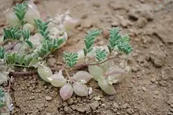 This is a very small perennial herb forming small mats or patches on the ground. The hairy stems are generally less than 3 cm (1.2 in) long. The leaves may grow to about 5 cm (2.0 in) long and are made up of several oval shaped leaflets. The inflorescence is an array of 3 to 13 small flowers, each white with purplish veins and tips.