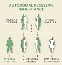An illustration of the inheritance pattern and phenotypic effects of an autosomal recessive gene.