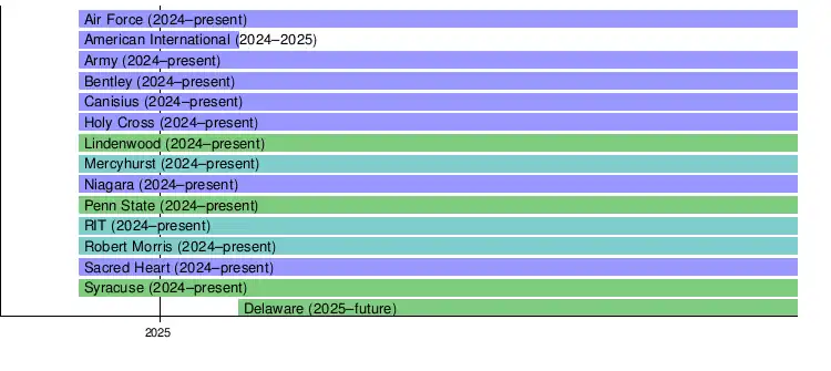 In 2010, the men's division of CHA collapsed and two of the remaining teams joined the Atlantic Hockey Association.[3] At that time, the two leagues began working together by sharing a commissioner and administrative staff in order to streamline their operating costs.[4] The arrangement worked well enough that by 2023, the two entities decided to formalize their relationship and announced that they were merging. The new league began with the 2024–25 season and is scheduled to welcome a new women's member, Delaware, in 2025.[5] However, the number of men's members will be reduced by one in the same year as AIC plans to drop its program to the Division II level, opting to place its hockey program in its all-sports conference of the NE-10.[6][7]
