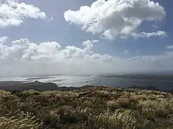 The southern end of the island broadens to a width of 26 kilometres (16 mi), encompassing Carnley Harbour. At the western side a very narrow channel known as Victoria Passage separates the main island from the smaller Adams Island.[4] Adams Island and the southern part of the main island form the crater rim; three kilometres (1.9 mi) north of Carnley Harbour's mouth lies Cape Lovitt, the westernmost point of New Zealand.